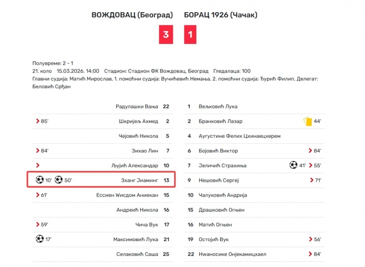 中国球员张家鸣首发踢满全场梅开二度,在加入沃日多瓦兹U19队后,出场的3次全首发打入三球,累计上场时间为269分钟。另外一名中国球员林子皓本场首发出场84分钟送助攻。
